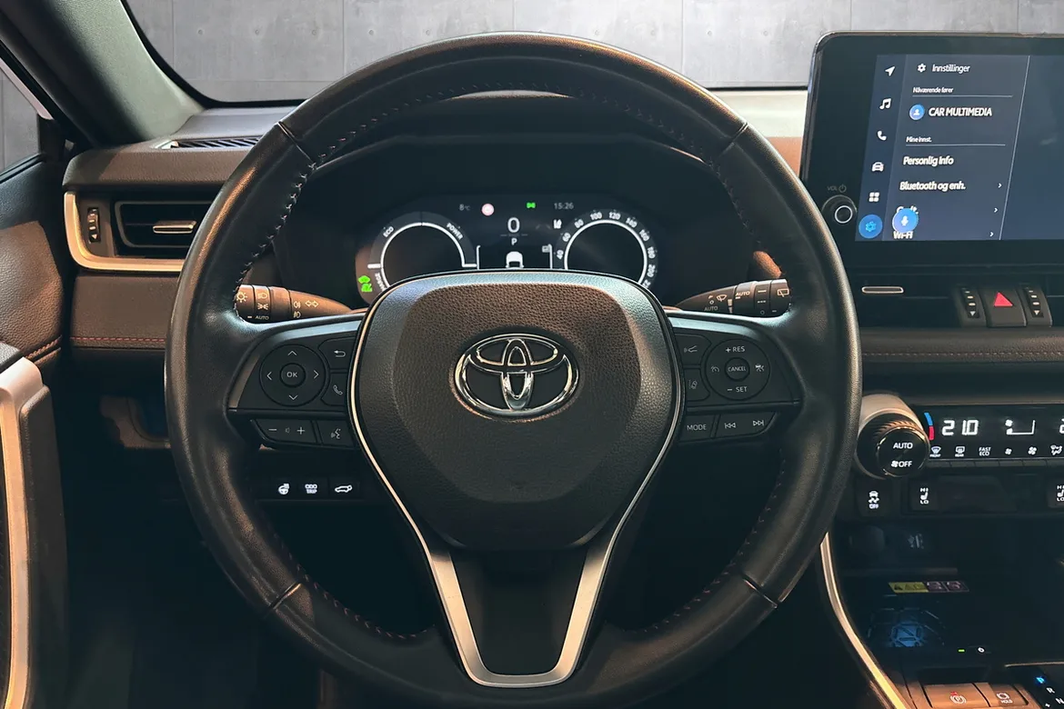 RAV4 er kjent for sin driftssikkerhet og gode kjøreegenskaper, og denne utgaven med plug-in hybrid og firehjulstrekk gir deg det beste fra to verdener: stillegående el-kjøring i byen og kraftfull bensinmotor når du trenger ekstra rekkevidde og trekkraft.