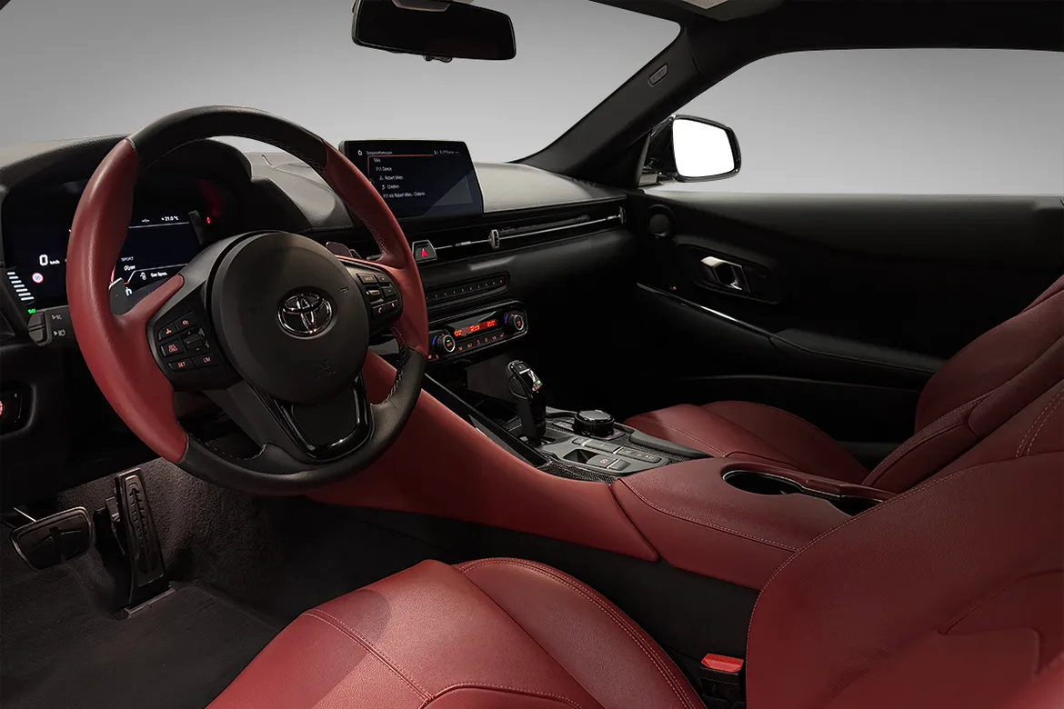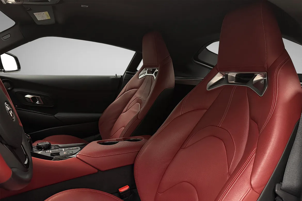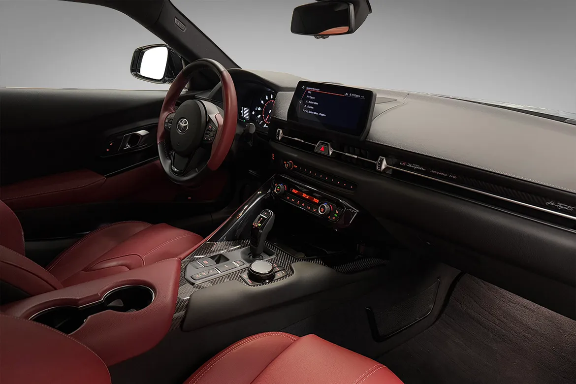 Kupéen i A90 Edition har racing inspirerte stoler trukket med rødt skinn. De er formet for å gi eksepsjonell støtte, mens rødt skinn på rattet og førerdøren, gjør interiøret komplett. I Premium utstyrsgrad er A90 en unik bil å sette seg inn i.