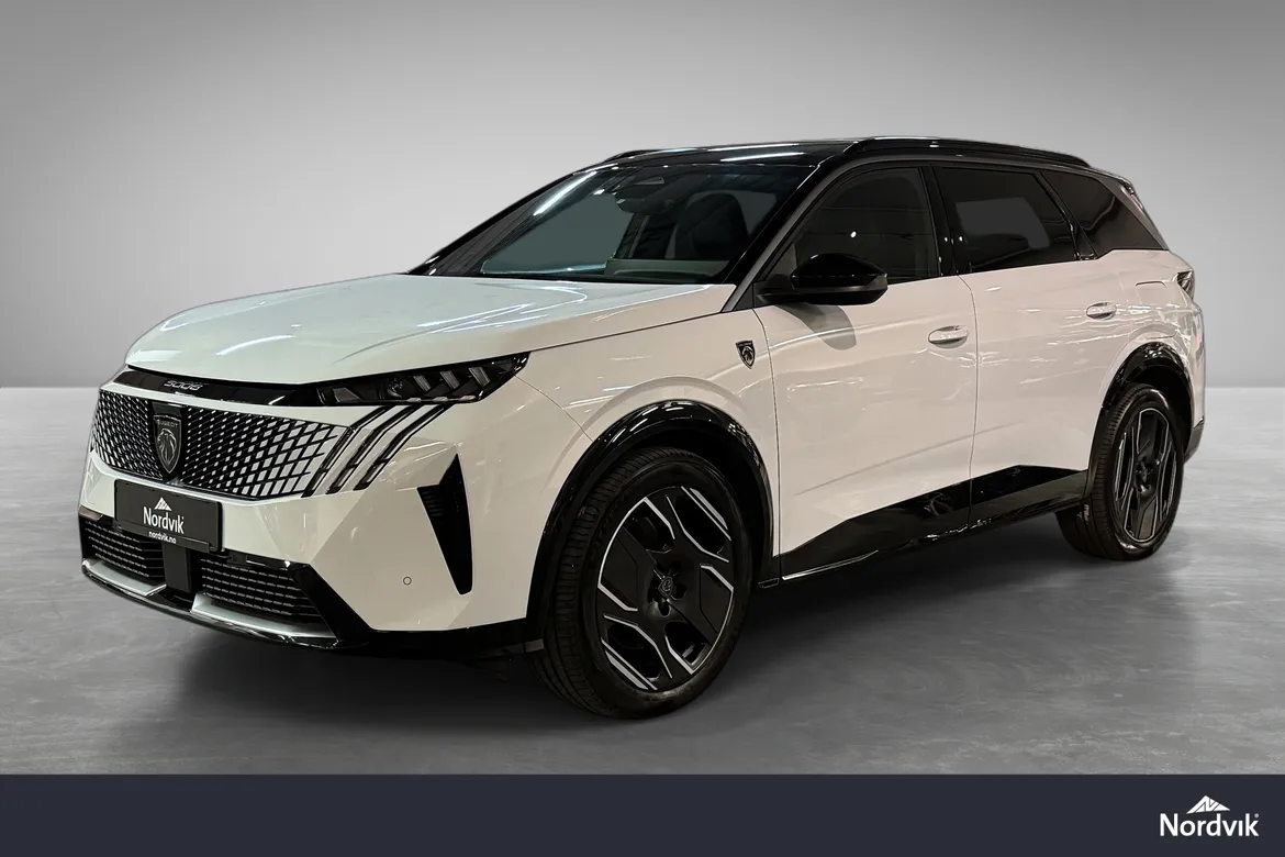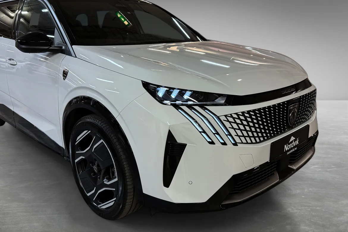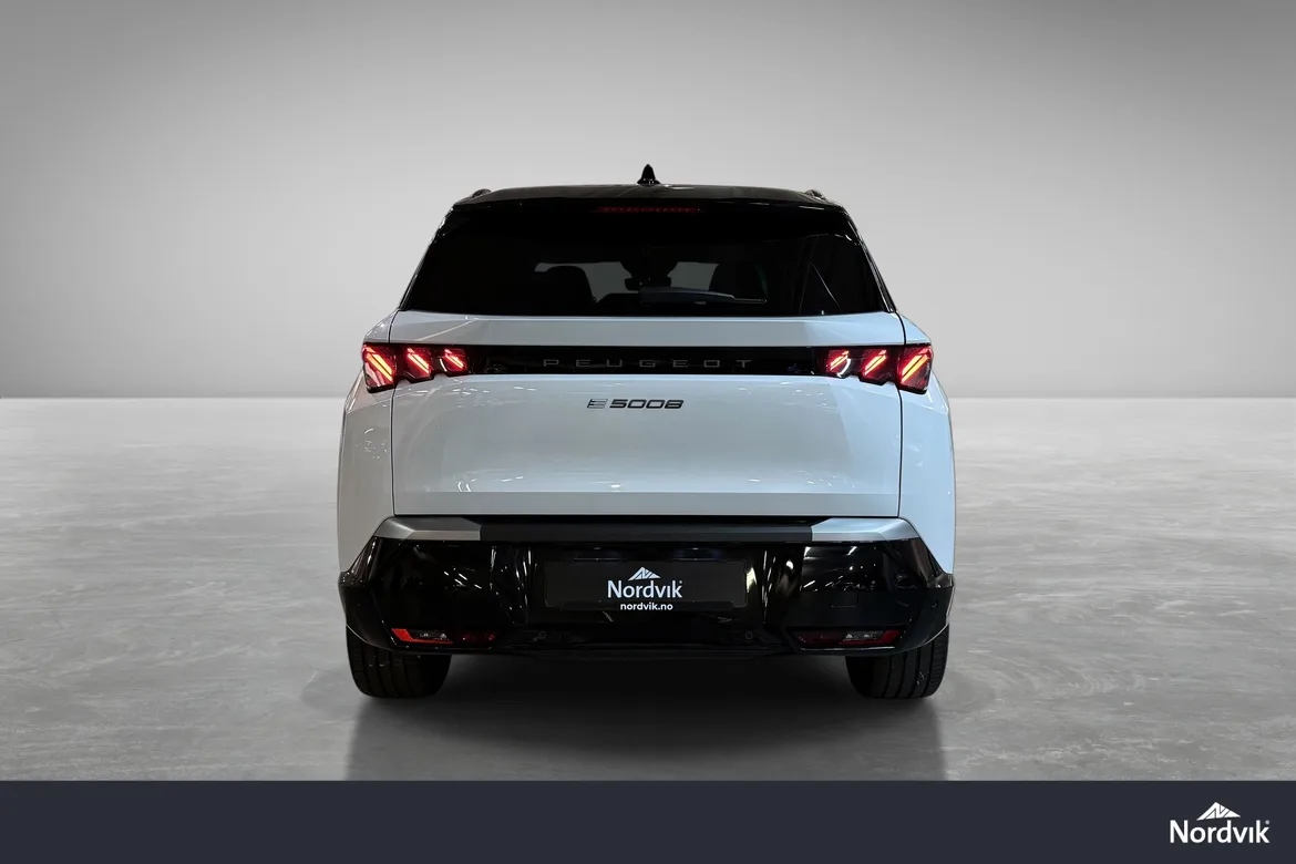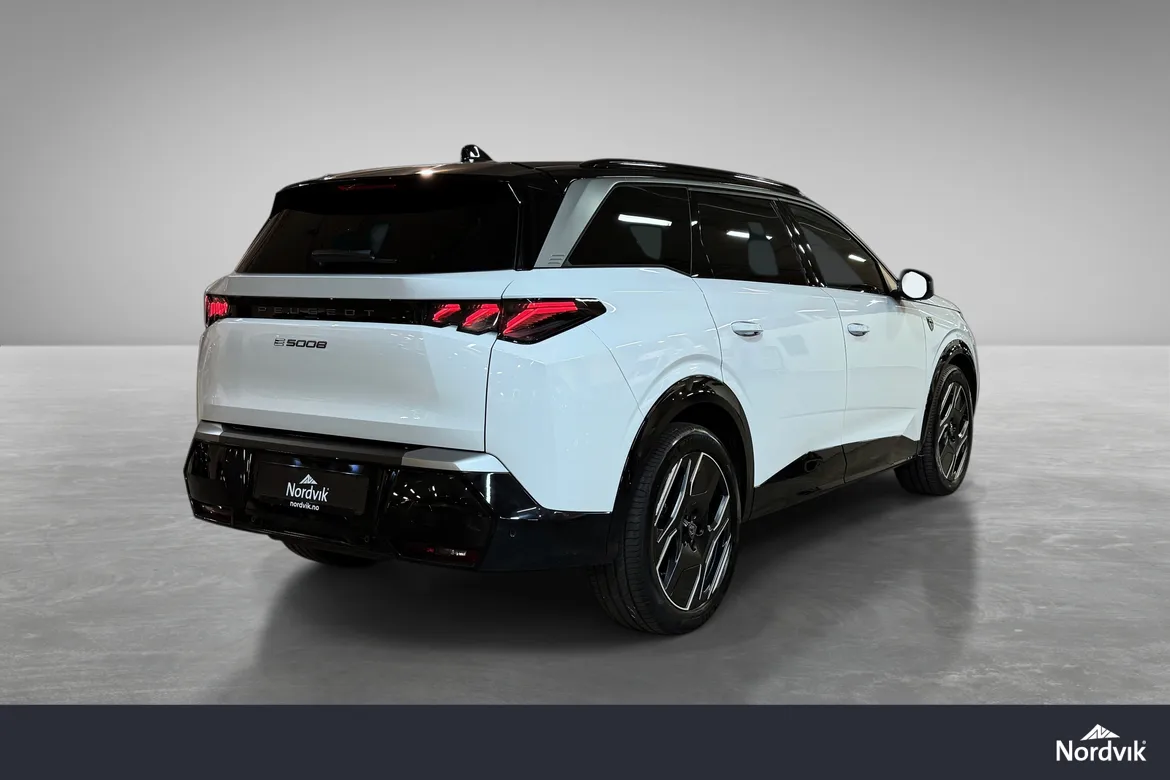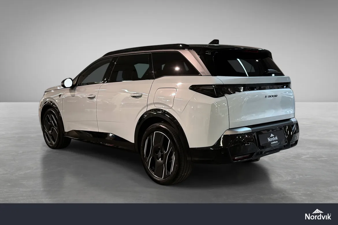AutomatPeugeot E-5008 GT representerer en helt ny generasjon elektriske familiebiler med fokus på komfort, plass og moderne teknologi. GT-modellen byr på høyt utstyrsnivå, gjennomført interiør, en stor buet i-Cockpit-skjerm og nydelige designlinjer som skiller seg tydelig fra konkurrentene. Nydelig farge kombinasjon med hvit metallic i kombinsjon med sort tak, mørke felger, mørke ruter og sorte eksteriørdetaljer.