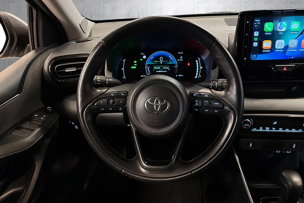 Stillegående, smart, pålitelig og lettkjørt. Det er mange grunner til at Toyota Yaris har vært blant Norges mest solgte bilmodeller i over 20 år. Et pent design som har moderne linjer. I likhet med bilens eksteriør er interiøret smart, komfortabelt og gjennomført. De gangene du trenger mer plass til større ting, kan baksetene legges raskt ned. Yaris Hybrid er rimelig i drift med en komfortabel drivlinje. Driftssikkerhet, trinnløst automatgir og lavt støynivå bidrar til at Toyota sine hybrid-eiere er blant de som er mest fornøyde!