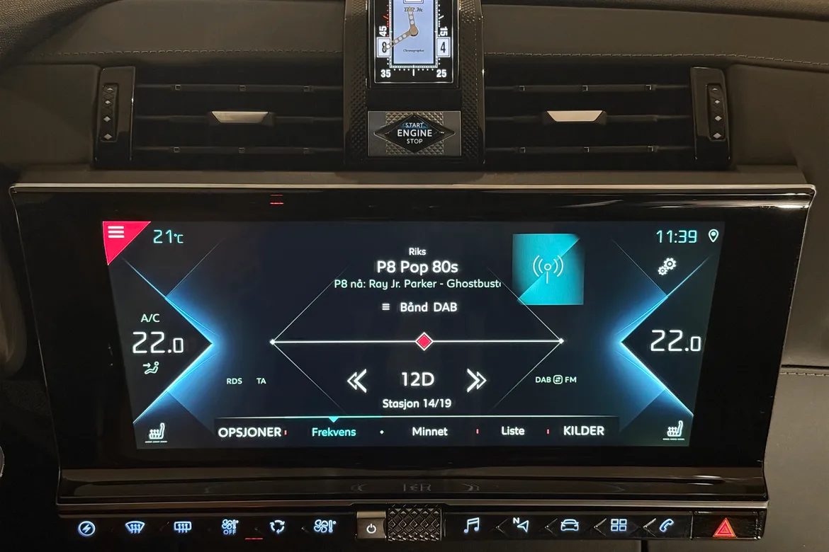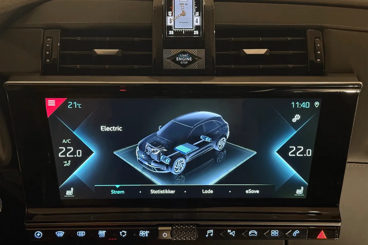 Interiøret er et høydepunkt i seg selv – med elektriske skinnseter med varme og minne, digital cockpit, navigasjon, og godt lydsystem. Bilen kommer med et motorisert B.R.M-ur som automatisk vippes opp når du starter bilen. Det er estetisk, et luksus, et designgrep – som understreker DS sin fokus på håndverk og detaljer. B.R.M (Bernard Richards Manufacture) er et fransk luksusklokkemerke som DS samarbeider med.