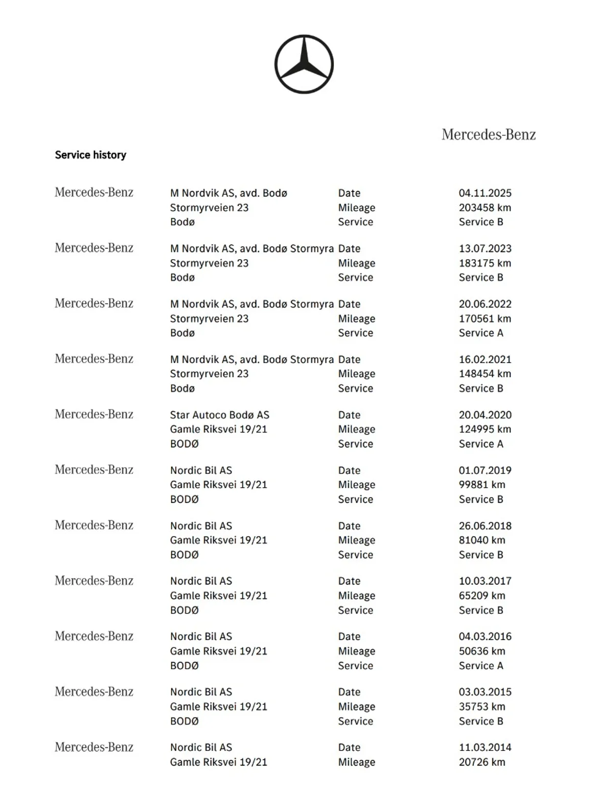 Det er utført stor service, utbedring av bremserør, samt bytte av bremser foran etter innbytte. Bilen er solgt ny i Bodø.